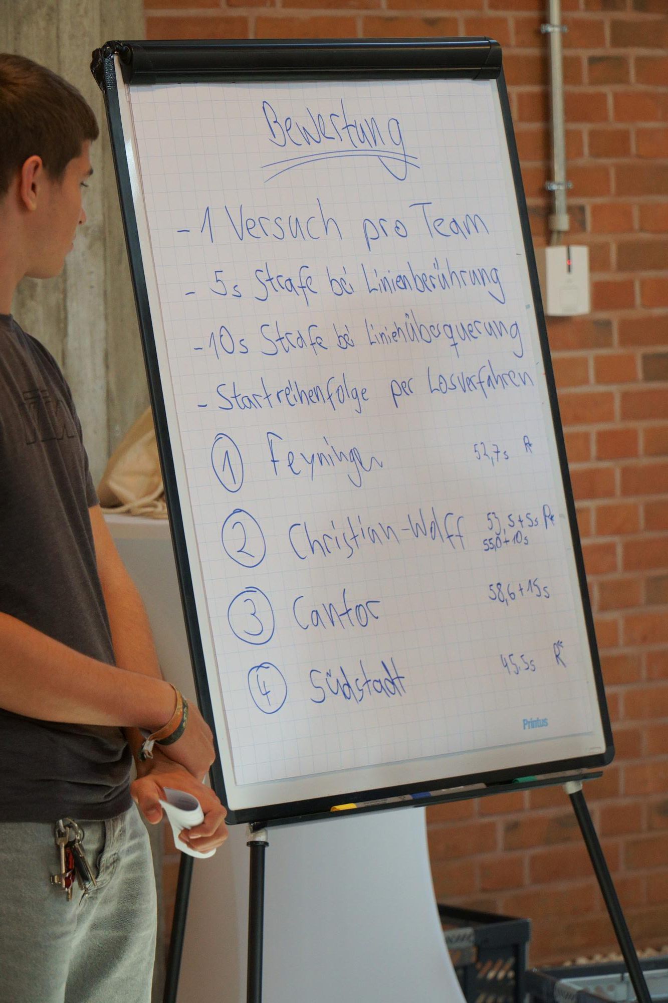 Aus den JIA-Schulen trat je ein Team an, um sich im Wettbewerb einer technischen Aufgabe zu stellen. In diesem Jahr hieß die Aufgabe, Lego-Roboter zu bauen und sie zu programmieren für den Durchlauf eines Parcours in möglichst kurzer Zeit und ohne Abweichungen von der Strecke. Die Schüler mussten mit einem unbekannten Robotersystem und einer unbekannten Programmierungs-App arbeiten. Zur ihrer Aufgabe gehörte es außerdem, nach einer vorgegebenen Skizze ihren Parcours zum Trainieren selbst auf dem Fußboden aufzuzeichnen. Die Aufgabe war nicht trivial. Keines der Teams konnte fehlerfrei den Parcours befahren. Eine moderate Juryentscheidung hat die zwei Teams zum Sieger gekürt, deren Roboter den Parcours bis zum Ende befahren haben. Das waren die Teams vom Christian-Wolff und vom Georg-Cantor-Gymnasium. Auf Platz zwei gelangte das Lyonel-Feininger-Gymnasium, Platz drei belegte das Südstadtgymnasium.
